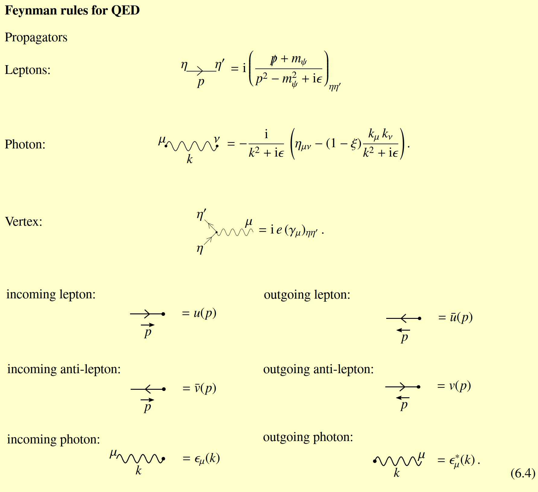 - \(\sum_s u_s(p)_{\xi} \bar{u}_s(p)_{\bar{\xi}}=(\not p+m)_{\xi \bar{\xi}}, \quad \quad \sum_s v_s(p)_{\xi} \bar{v}_s(p)_{\bar{\xi}}=(\not p-m)_{\xi \bar{\xi}}\)